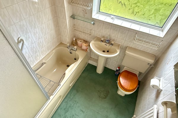 6' 5" x 6' 2" (1.96m x 1.88m) Beige coloured suite comprising panelled bath with electric shower, wash hand basin, WC, fully tiled walls