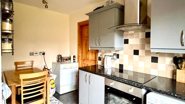 13' 4" x 9' 7" (4.06m x 2.92m) High & low level units, built-in oven & hob, extractor fan, 1½ bowl stainless steel sink, plumbed for washing machine, partially tiled walls, tiled floor, dining area