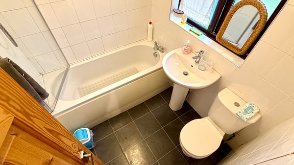 6' 5" x 5' 6" (1.96m x 1.68m) White suite comprising panelled bath with electric shower, wash hand basin, w.c., fully tiled walls, tiled floor
