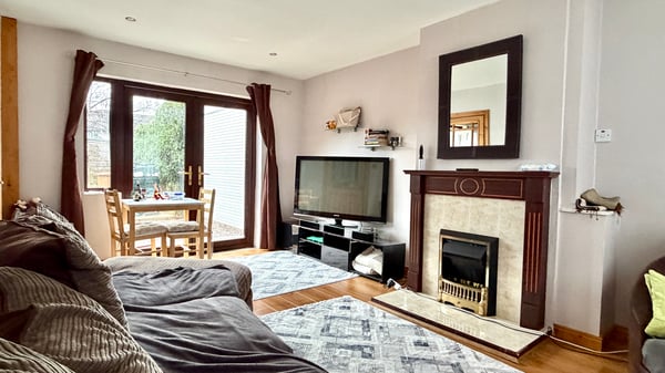 17' 0" x 10' 10" (5.18m x 3.30m) Ornamental fireplace, laminate floor, patio doors