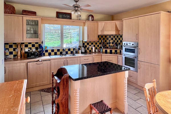 Modern beech shaker style kitchen with built-in oven & hob, integrated dishwasher and fridge freezer